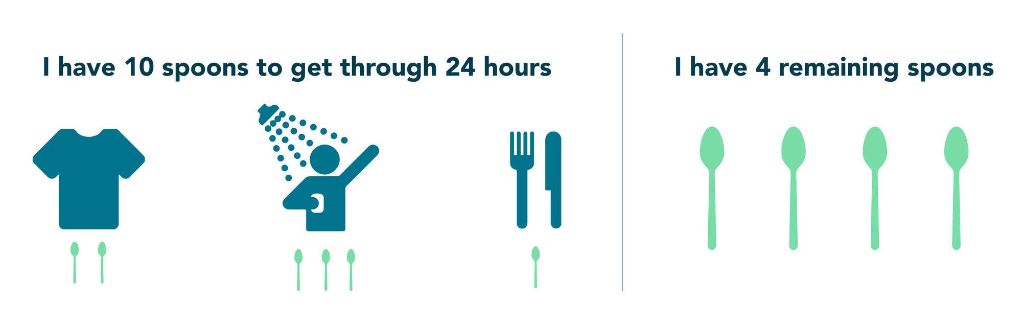 Imagine that a handful of spoons represents the amount of energy one has in a single day. Every single task – like showering, getting dressed, and eating breakfast – costs a spoon. A chronically ill individual might run out of spoons before lunchtime, while a healthy individual may have spoons to spare at the end of the day.